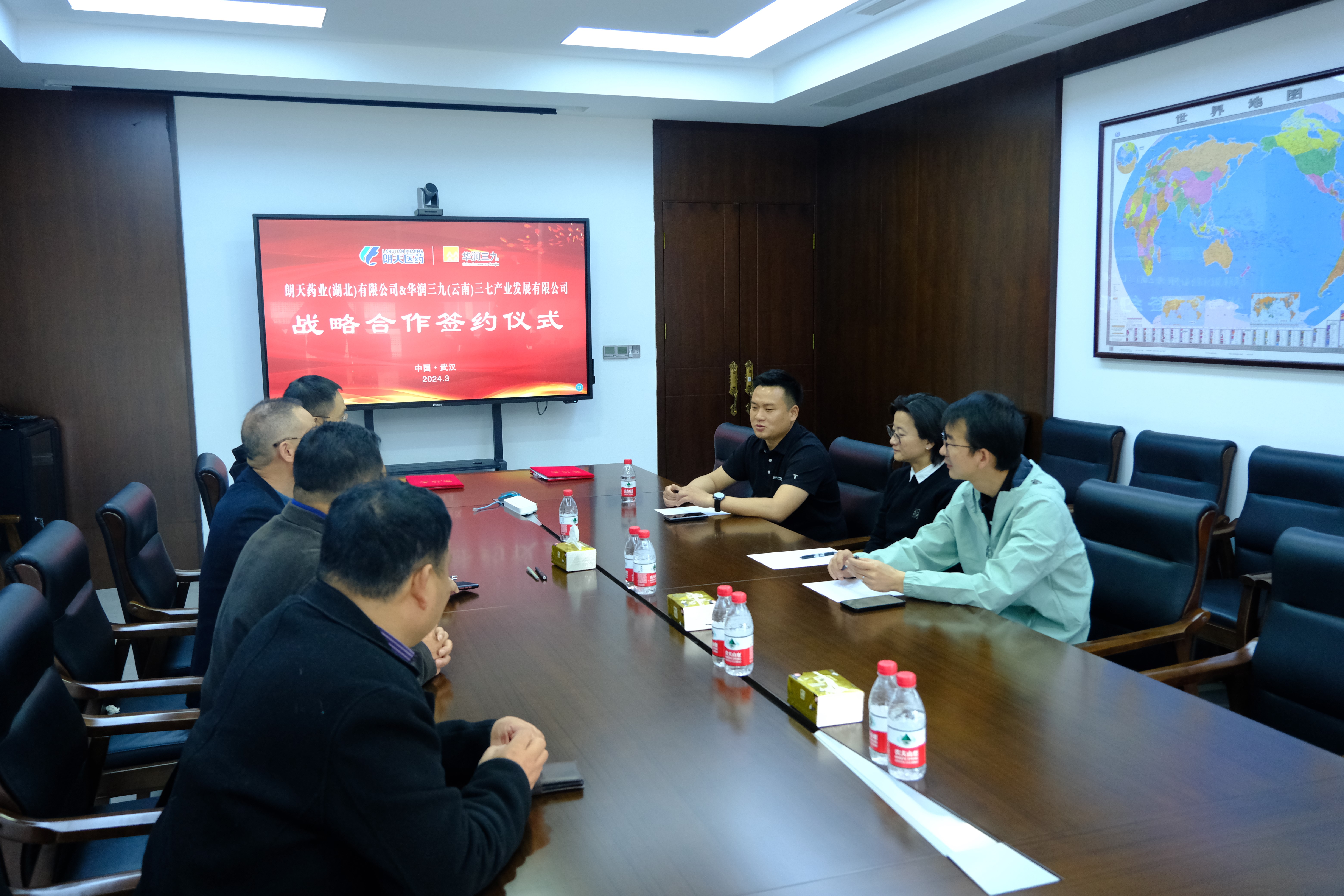 蔡翔董事长欢迎各位嘉宾光临。蔡董表示,2023年来,华润三九(云南)三七公司作为我司核心产品“血塞通滴丸”主要原料“三七总皂苷”的供应商,产品质量稳定可靠,为双方长久合作打下了良好基础。公司“血塞通滴丸”为国家中药集采中标品种,近两年公司大力运作,已进入国内5000多家等级医院,以及数万家基层医疗机构,销量显著增长,质量和疗效深受好评,市场前景十分良好。为满足市场需求,在原料供应及时性、价格稳定性等方面需要进行战略性规划,而华润三九(云南)三七公司是致力于三七产业发展的央企,原料资源优势突出,基于各自需求和市场趋势,希望通过资源共享,优势互补,打造双赢、可持续发展的战略合作伙伴关系。